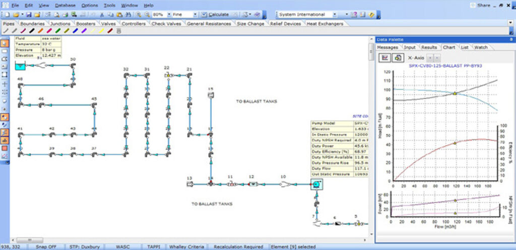 The vessel had an existing ballast pump that was capable of 150 m3/hr at 9 bar. The team at Cochin Shipyard Ltd checked the suitability of the existing pump for this upgraded application using FluidFlow. The reworked pipes and fittings were modeled together with pump performance data which was provided by the pump manufacturer. Figure 1 above provides an illustration of the overall system.