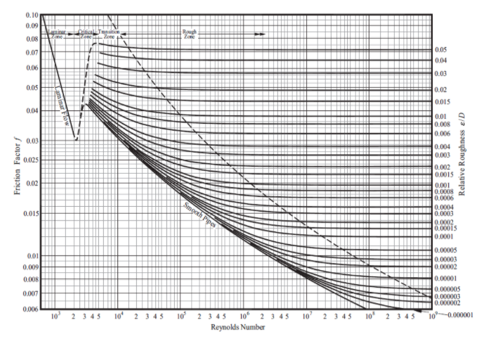 The Moody chart is a graphical representation of the friction factor (f) for all flow regimes (laminar, critical & turbulent) against the Reynolds Number at various values of the Relative Roughness of the pipe. Figure 3 gives an example illustration of the Moody Chart.