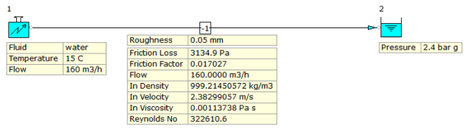 The following example as shown in Figure 4 demonstrates the calculation of Reynolds Number and Friction Factor for a pipeline transporting water at a flow rate of 160 m3/h. The Reynolds Number is calculated as 322610.6 and the Friction Factor is calculated to be 0.017027. This example is based on a pipe absolute roughness of 0.05 mm which is common for new or clean pipes. Users have the option to change the absolute roughness value to reflect your specific design conditions.
