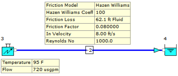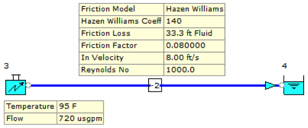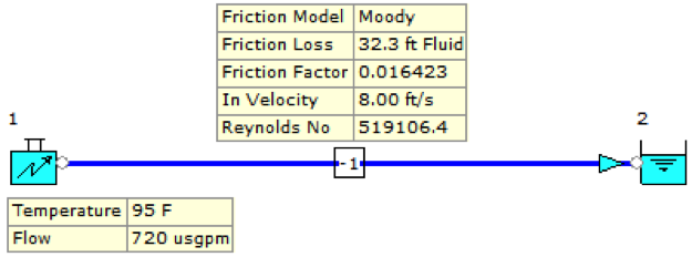 The modeled value for friction loss is 33.3 ft fluid which is close to the hand calculation value of 33.5 ft. Again, the difference can be attributed to the simplifications of the hand calculation by comparison to the modeled solution.