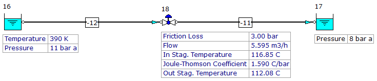 FluidFlow takes account of the Joule-Thomson coefficient when solving gas flow systems using real gas conditions. Figure 2 details the calculation of Joule-Thomson coefficient for a pressure control valve in a pipeline transporting a mixture of n-butane and n-pentane at a pressure of 11bar and temperature of 390K.