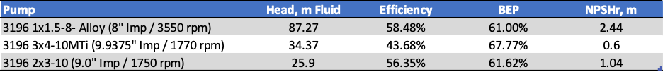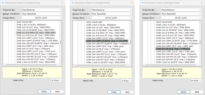 In this example, we are trying to compare the performance of three (3) different pump models when required to transport 28 m3/hr of flow: