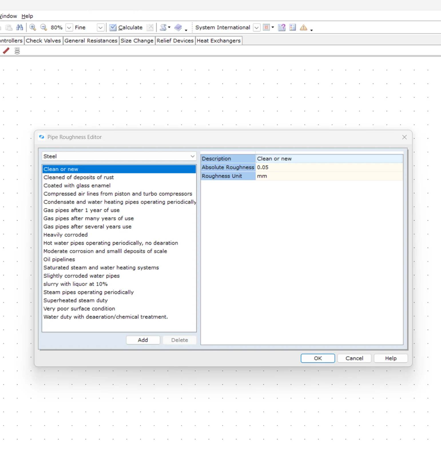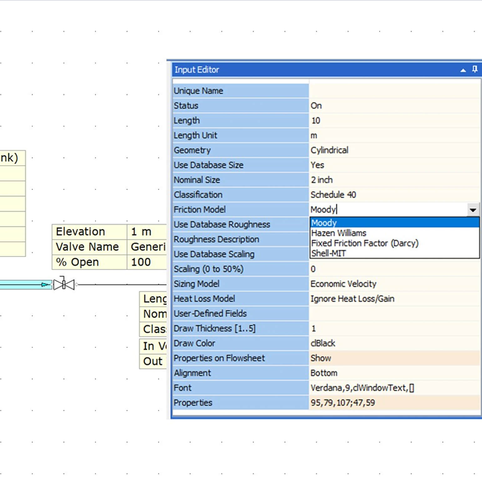 Choose from Darcy–Weisbach, Hazen–Williams, Shell–MIT, or fixed friction factor methods.